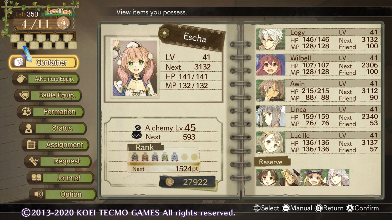Ao concluir a atribuição, o jogo coloca você no “Free Time”, o qual pode ser usado para desenvolver com calma seus laços com os personagens de suporte, melhorar a qualidade de vida de submecânicas, brincar no Synthesis, ou completar os Assignments restantes para melhorar sua avaliação. Embora o melhor seria não ter o Time Limit, e olhando para os jogos que já joguei que abusam dele, Escha & Logy é o que melhor o implementa, respeitando o contexto ao qual ele se encaixa.