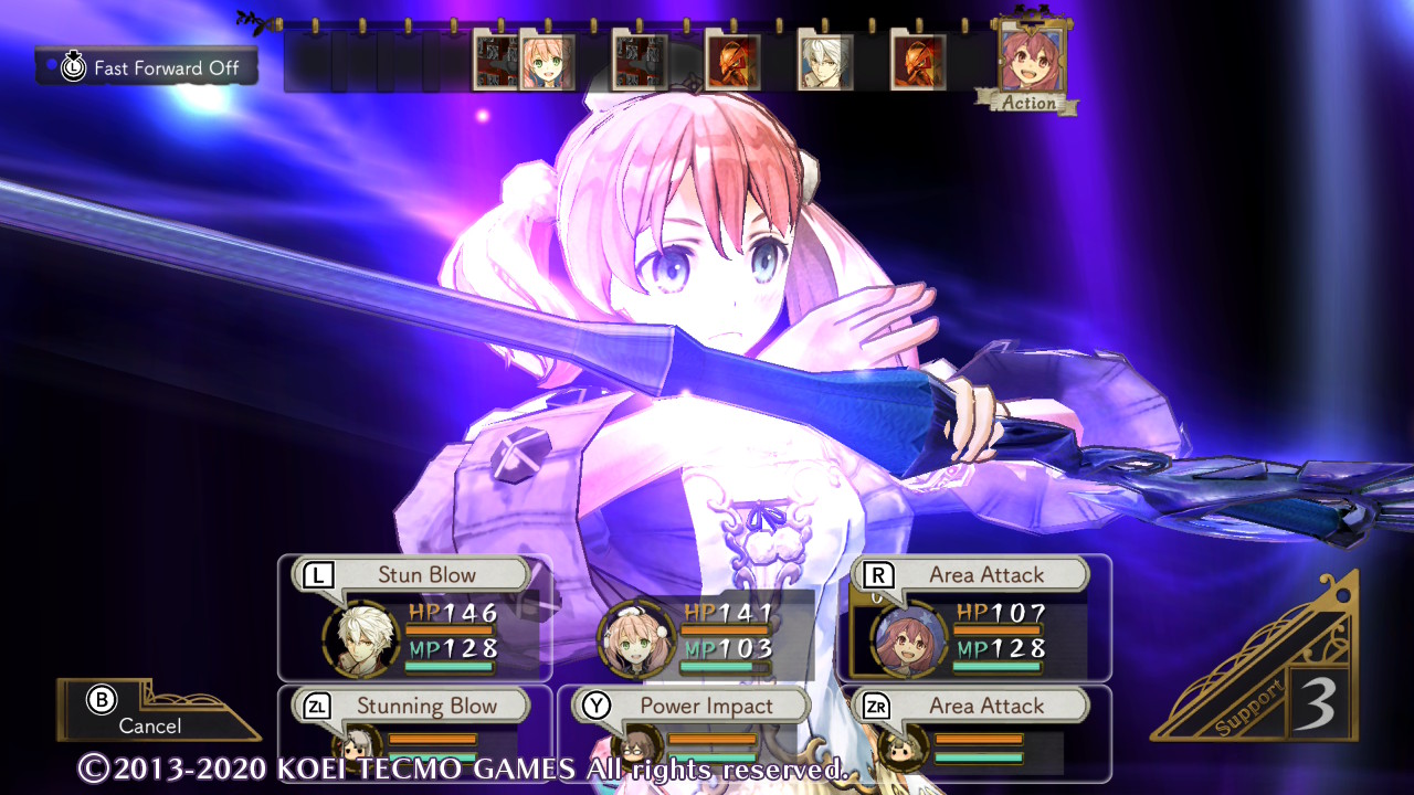 As coisas são mais divertidas quando a party está cheia, pois assim você consegue extrair o potencial máximo deste segmento através das submecânicas de Support Attack ou Support Guard — tais ações permitem executar ataques em cadeia ou defender um aliado no turno inimigo ao consumir contadores de Suporte que aumentam desferindo dano por ataques normais, skills ou bombas e consumíveis. Se o Damege Rate atingir 200% sem quebrar a cadeia, o último personagens poderá performar uma ação ainda mais poderosa.