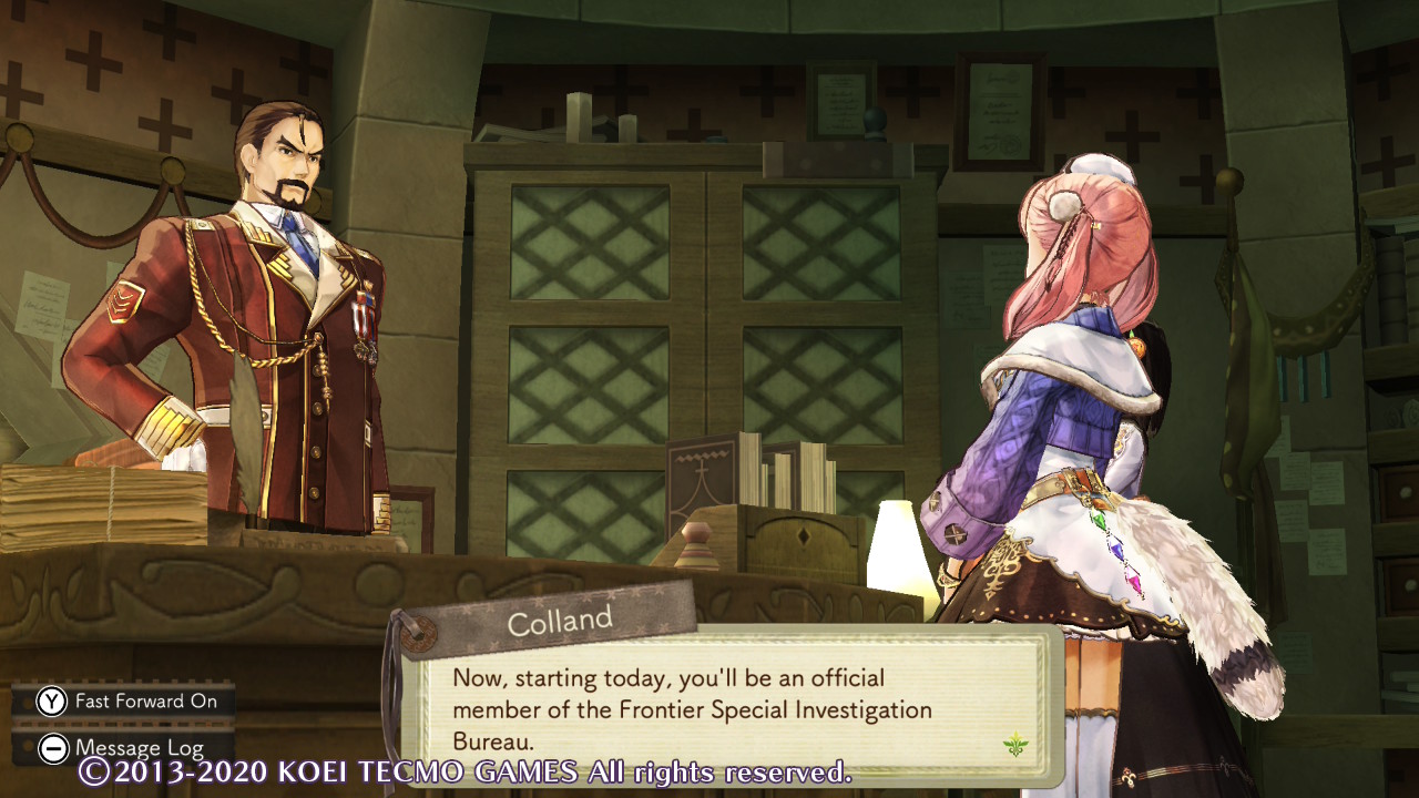 Presumidamente, por ter escolhido a campanha da Escha, a progressão da história anda devagar em razão dos aspectos sociais e desenvolvimento de personagens; o jogo parece uma versão fantasiosa do lúdico anime de vida cotidiana de funcionários públicos, Servant x Service. Mas não é como se eu estivesse reclamando dos elementos de slice of life do jogo não, afinal, é uma das coisas que mais me atraem em Atelier.