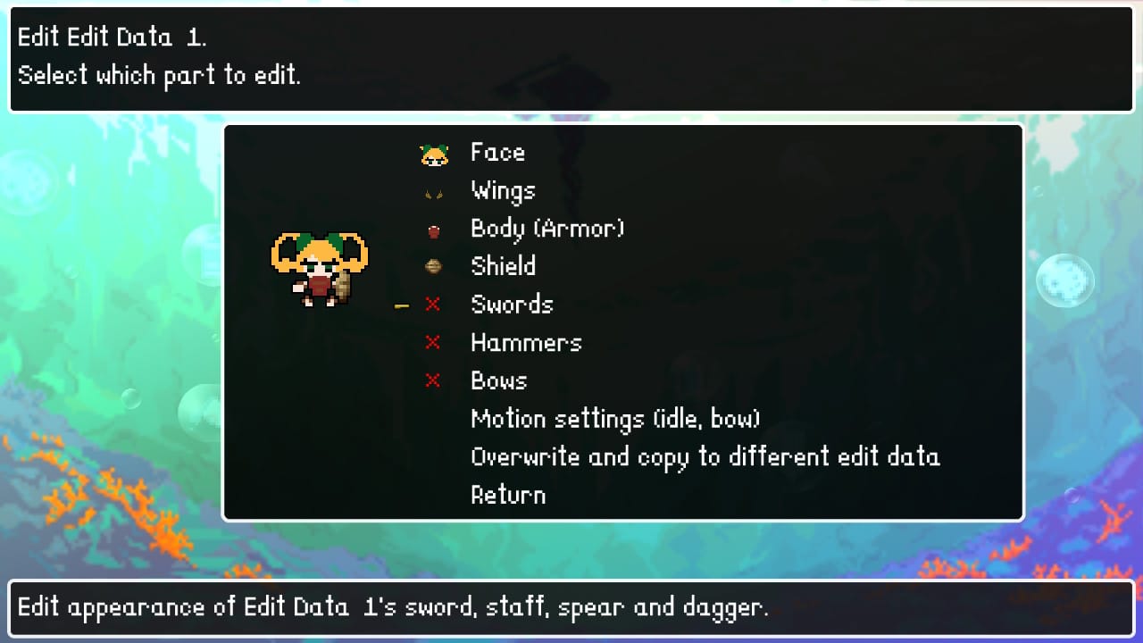 A forma que a customização de Cladun X3 é importante já começa quando você cria o seu primeiro personagem; você vê que apesar de ter uma certa variedade, você está limitado inicialmente. Isso acontece porque o jogo possui “níveis de dificuldade” de customização, com o quanto mais difícil a customização, mais coisas você pode colocar no seu personagem, como acessórios, asas, mudança de cores específicas da paleta, etc.