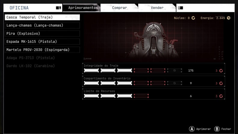 A maior parte dos upgrades podem ser realizados usando a “moeda” do jogo, as Energias. Outras, no entanto, como a armadura, requerem que encontremos Núcleos, um item bem mais difícil de achar. A gente consegue achá-los em lugares específicos onde a exploração é opcional, em alguns pontos seguros ou com gatinhos que encontramos andando por Nova Alvorada. Chega até a ser engraçado a interação da nossa personagem — quase um robô seguindo uma diretriz — se derretendo pelos pequenos felinos quando os encontra.