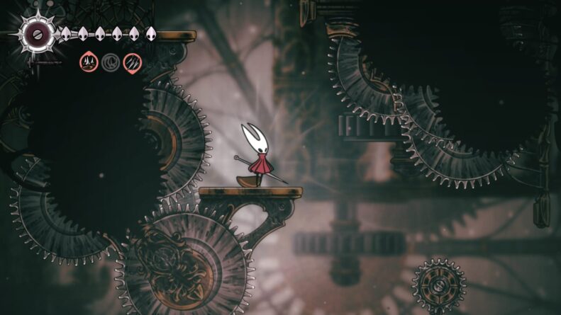 O mapa, enfim, é repleto de objetos que auxiliam no parkour da protagonista, adicionando uma riqueza a mais na exploração. Faz as sessões do jogo original parecem uma tech demo do que estava por vir em Silksong, sendo esta uma das melhores que já vi em um metroidvania, superando até mesmo Prince of Persia: The Lost Crown, outro grande título com mecânicas de movimentação similares.