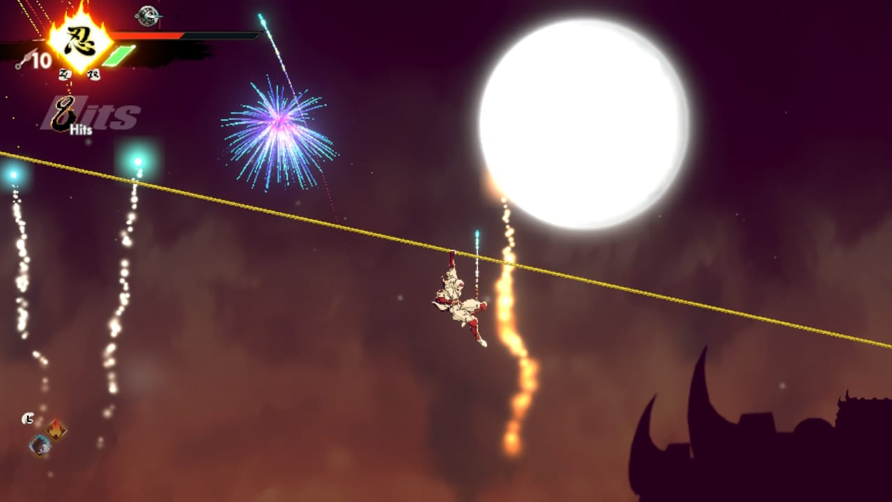 Em questão de trilha sonora, eu consigo dizer que ela é boa, variando entre os momentos de plataforma e os momentos de ação, mas admito que nenhuma delas grudou em minha cabeça como espetacular, basicamente cumprindo tabelas de tudo que se espera de um jogo com temática ninja, com os instrumentos esperados de Japão tradicional com o uso de guitarra para momentos frenéticos.