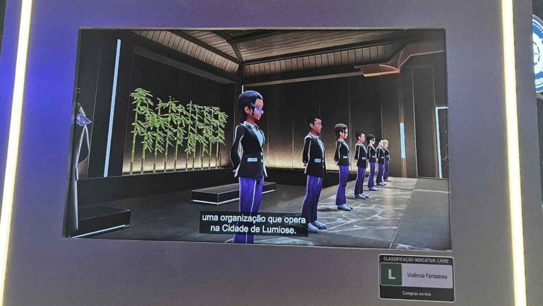 Agora, a parte que mais me desapontou foi que, no tweet, dizia que a gente poderia explorar tudo do novo game Pokémon Legends: Z-A, que será lançado muito em breve na próxima semana. Eu leio isso e penso: Ah, que legal, deve ter alguma versão de demonstração pro povo dar uma olhadinha? Ahh, quem me dera. O máximo que tinha era um pilar com uma TV pequenina passando o teaser trailer com legendas em português. Eu juro pra vocês que era só isso. No geral, o estande de Pokémon pode ser resumido da seguinte forma: prometeu muito, mas entregou pouco em suas promessas.