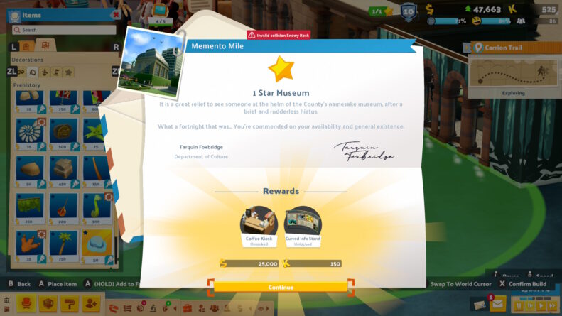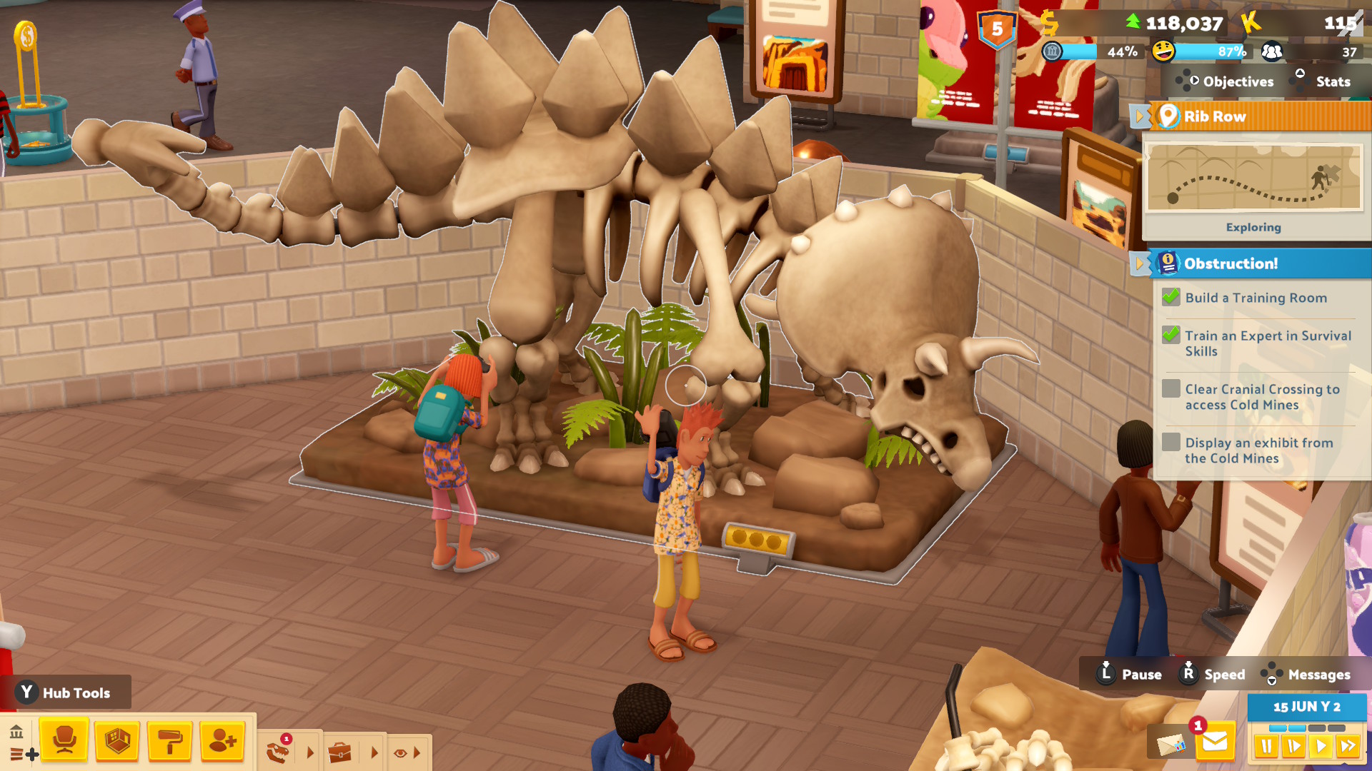 Claro, o jogo não atira de uma só vez as informações em direção do jogador. A progressão é feita a partir de uma série de objetivos, e conforme progredimos nós desbloqueamos novas áreas de expedições, cômodos e até outras regiões para construirmos outros museus. O título toma cuidado em não sobrecarregar o jogador de informações, ao mesmo tempo em que consegue dividir bem os tutoriais para evitar fadiga de texto. Como o museu é avaliado pela secretaria da cultura, nós precisamos almejar certa pontuação de estrelas; um sistema que equilibra em uma dose saudável a carga de informações.