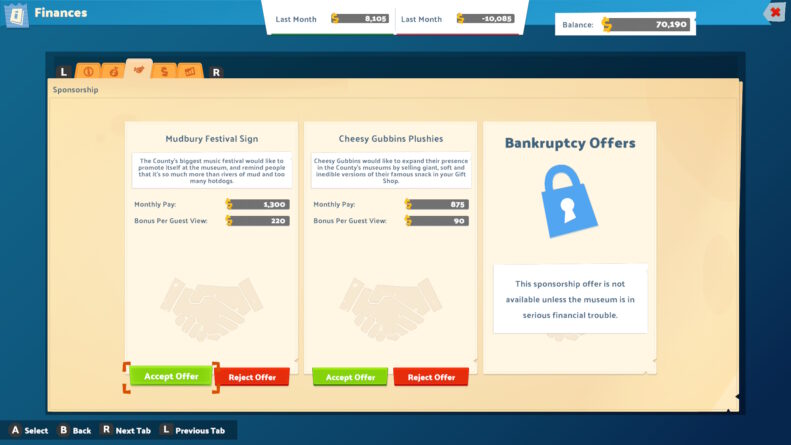 Mais do que buscar caixa, o desafio é buscar lucro. A saúde financeira do museu possibilita sua expansão em novos lotes, expedições mais caras com itens ainda mais exóticos e treinamento de staff para otimizar atendimento, evitar tragédias em expedições e deixar o gerenciamento “ser tocado sozinho” a partir do equilíbrio de todas as peças. Para aumentar o faturamento, temos opções que variam entre o menos e o mais drástico: podemos topar parcerias com marcas e expor propaganda no museu, aumentar preços de consumíveis e até da entrada do museu. Em resposta, a variação dos clientes varia, e um estabelecimento com baixa satisfação gera menos visitas, menos receita, e prejuízo novamente.