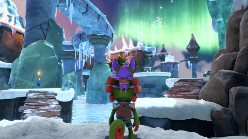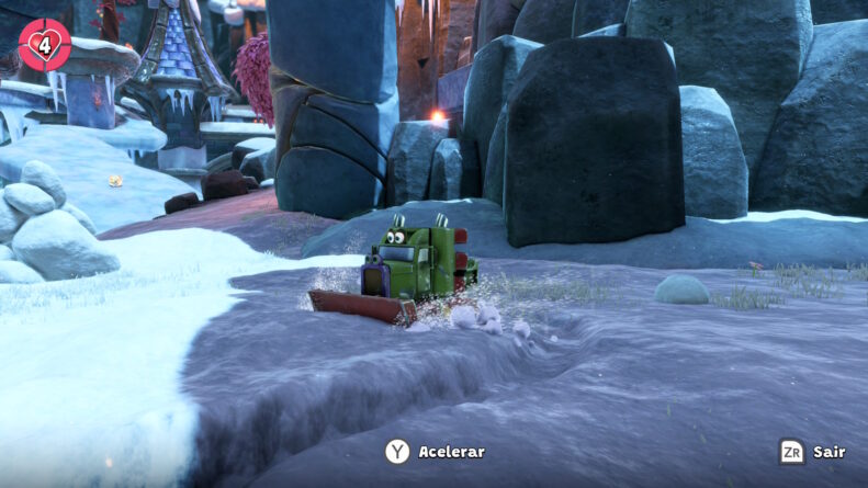 Pra dar uma variada maior nas coisas, cada mundo contém uma transformação única que vai te ajudar a concluir algumas missões específicas: o segundo mundo, por exemplo, te transforma num trator de neve, e eu admito que foi bem engraçado quando eu vi pela primeira vez. As transformações são bem-vindas, muitas das missões não as utilizam, mas elas deixam as coisas menos repetitivas quando você sente que tá se cansando de explorar os mundos normalmente.
