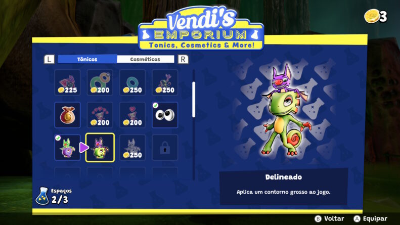 O sistema de Tônicos é bem fofo. Eles são basicamente “efeitos especiais” que serão aplicados à sua jogatina, desde coisas bestas como “inverter as cores de Yooka e Laylee” ou “aplicar um filtro de Cel-Shading ao jogo”, até alguns bem impactantes, como um que permite que você não perca moedas ao morrer. É um sistema bem divertidinho de se brincar, mas totalmente opcional — tá aqui só pela diversão mesmo. Mas vale à pena dar uma brincadinha nele, alguns dos efeitos são genuinamente bem engraçados.