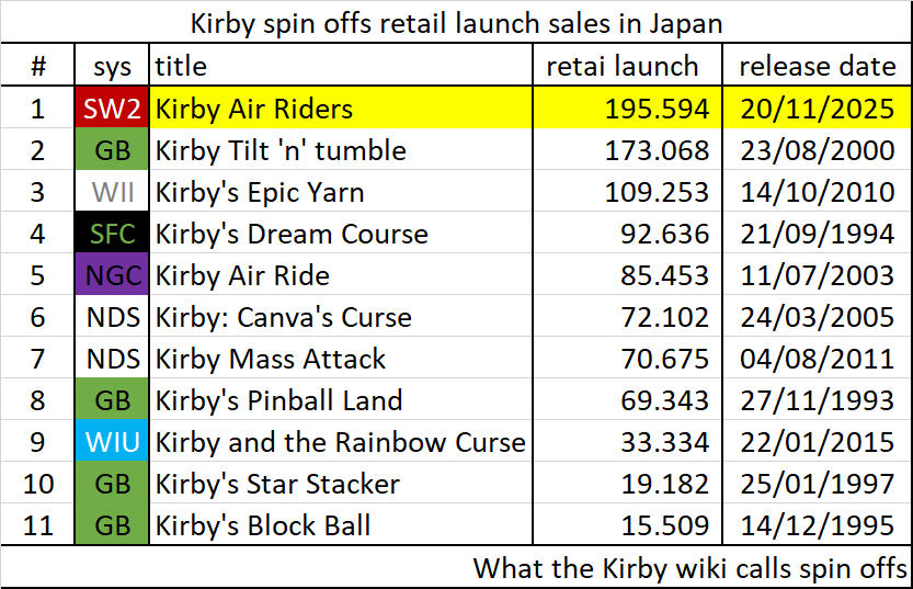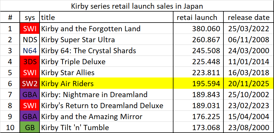 Agora, em relação a todos os jogos de Kirby, mainline e spin-off, Kirby Air Riders configura em sexto dentre as maiores estreias da série no Japão, números surpreendentemente bons considerando a base instalada atual do Switch 2. Kirby and the Forgotten Land ainda é o jogo Kirby com a maior abertura de toda a série no Japão.