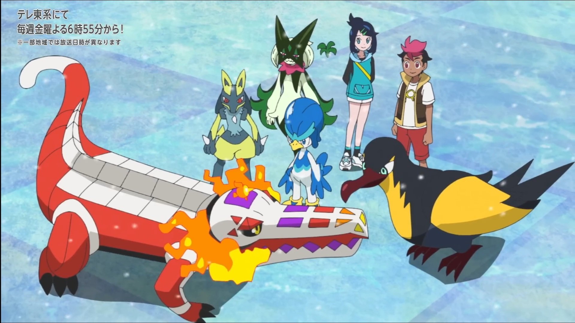 O novo jacaré parece feliz e já não era sem tempo. Depois de tanto tempo de batalhas ele deveria ter evoluído ainda no primeiro arco, mas claramente foi deixado de lado desde que Lucario passou a compor o time do Roy. Agora só falta o pato sambista horroroso evoluir para o trio protagonista estar “na sua forma final”. Mas apostaria que cada um ainda vai capturar mais um ou dois. Confesso que têm sido um pouco estranho ter 3 protagonistas sem um time completo, mas acho que faz sentido também. Agora 4 com Uruto, né.