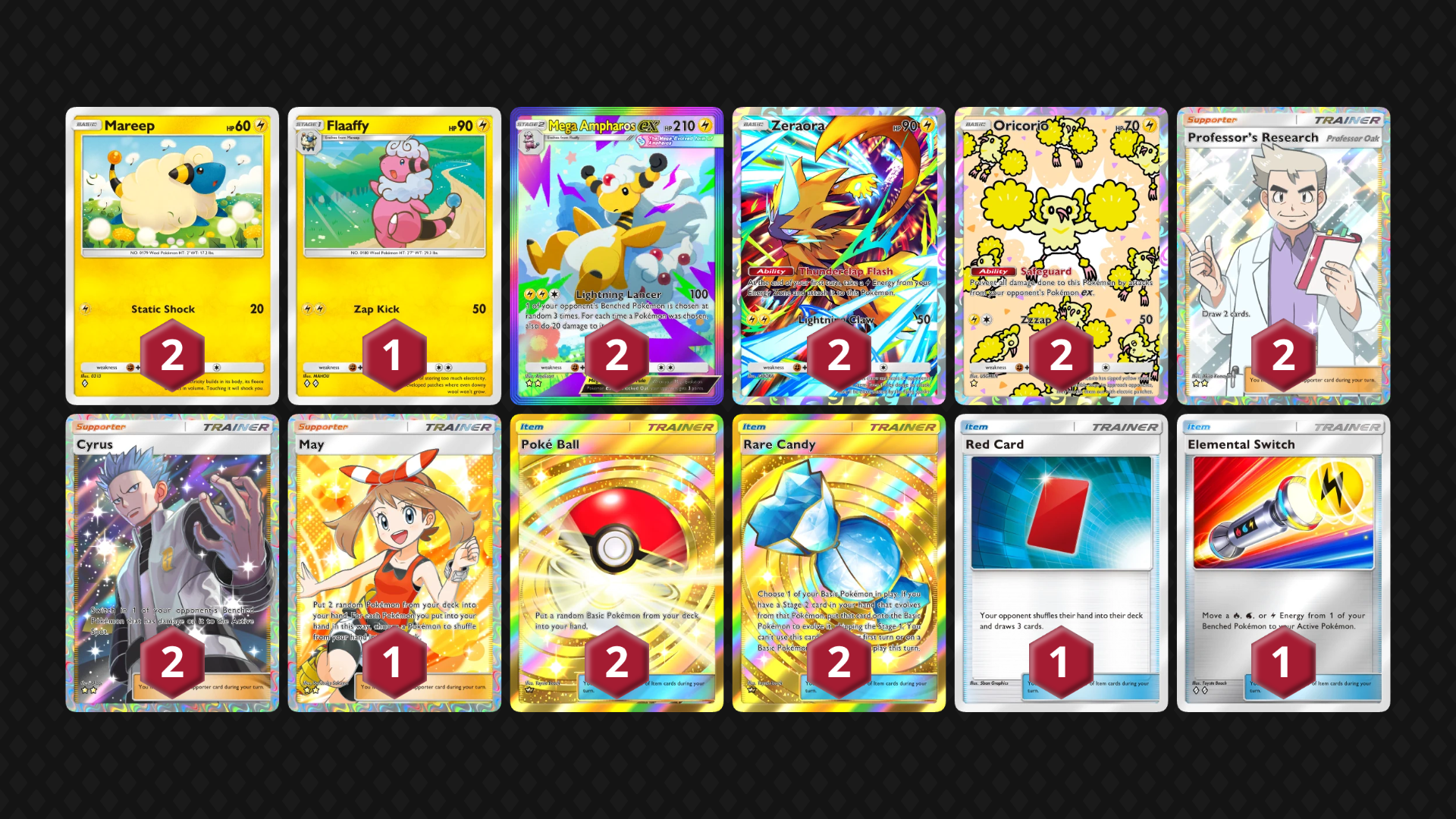 Com isso em mente, visamos ganhar turnos com Zeraora e Oricorio e conseguir executar o setup de um Mega Ampharos ex no late-game. A maior motivação que nos leva a utilizar duas cópias de Cyrus neste deck é o fato de que a própria distribuição de dano de Mega Ampharos ex por si só já torna o uso do Apoiador um fator que lhe fará vencer jogos com toda a certeza.