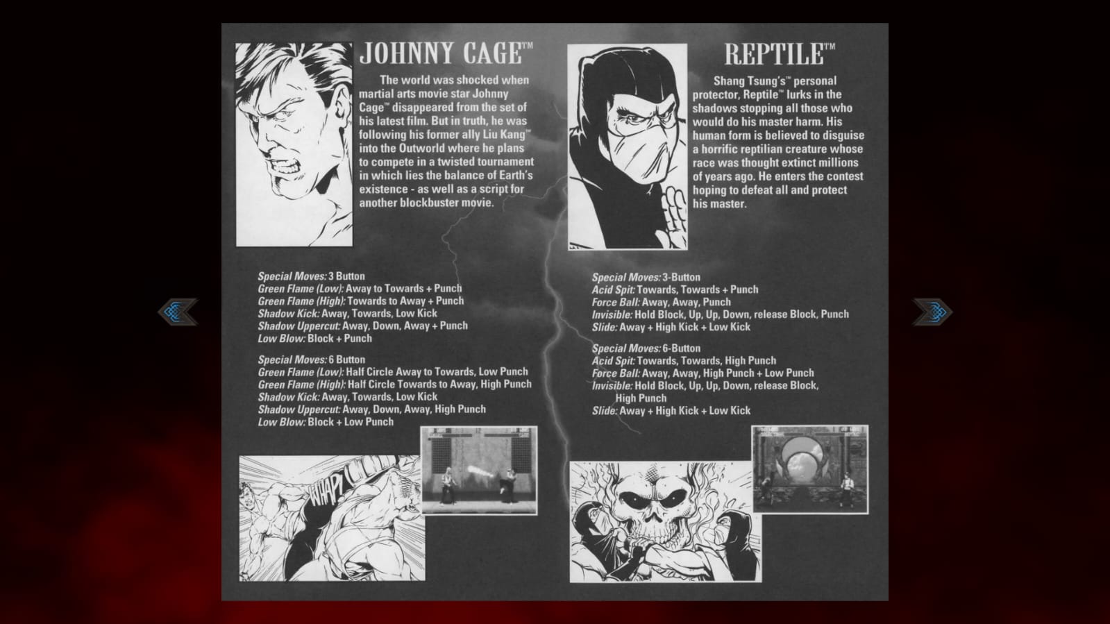 A coisa mais interessante de Legacy Kollection, no entanto, se encontra no modo A Kripta. Aqui nós temos um rico material documental que narra, com detalhes, seja em vídeos, entrevistas, pôsteres, manuais, músicas e artes conceituais, todo o aspecto criativo do desenvolvimento de cada um dos jogos e a respectiva história dos personagens. Explorando esse material, por exemplo, descobri que a versão estadunidense de Mortal Kombat II (e outros), para o Mega Drive (Genesis), diferente do Brasil, contava com um manual de instrução que detalhava não só golpes especiais dos personagens, quanto suas respectivas finalizações.