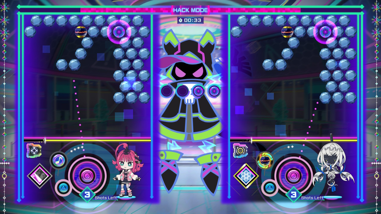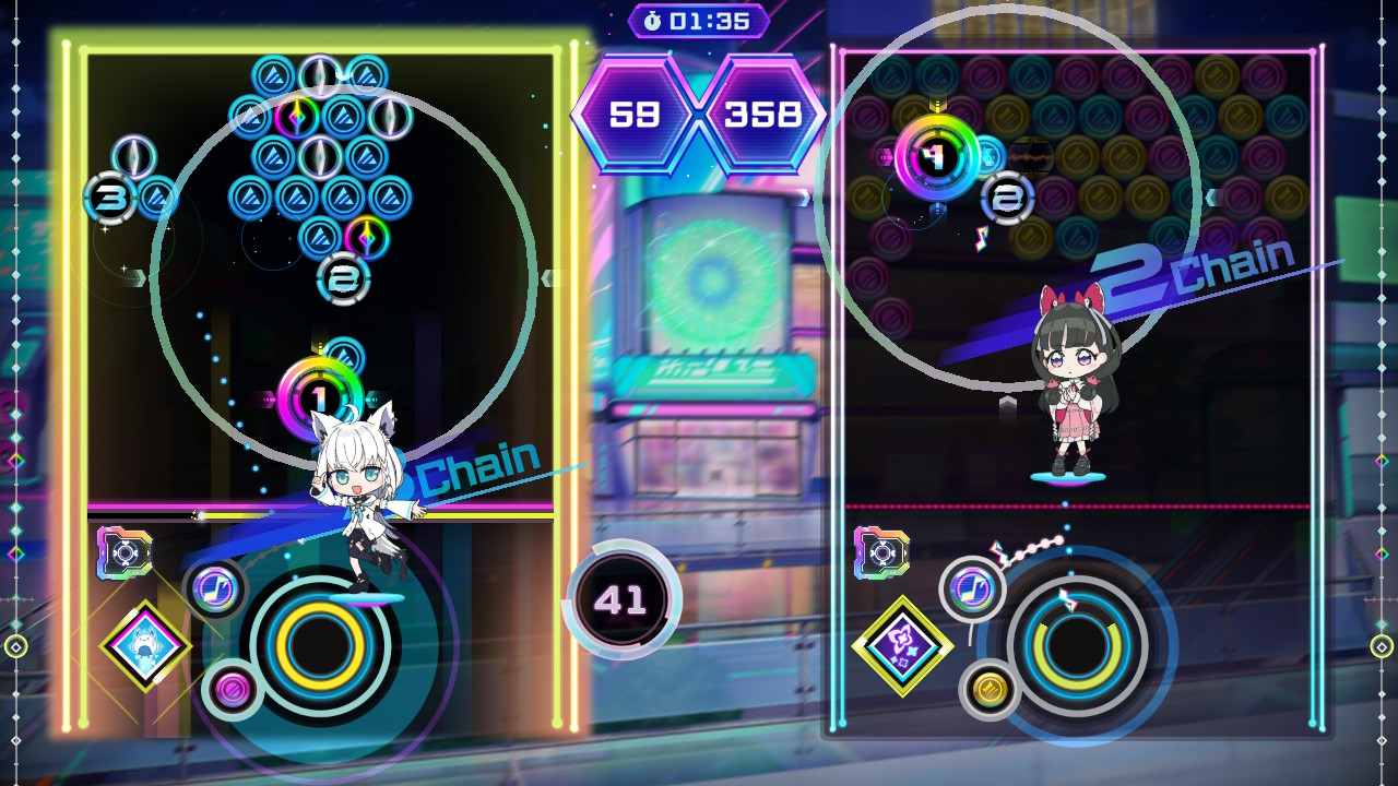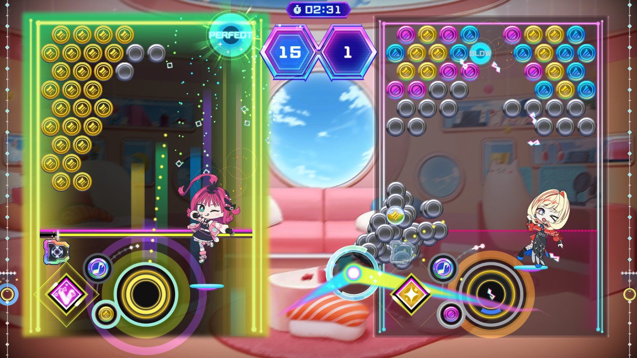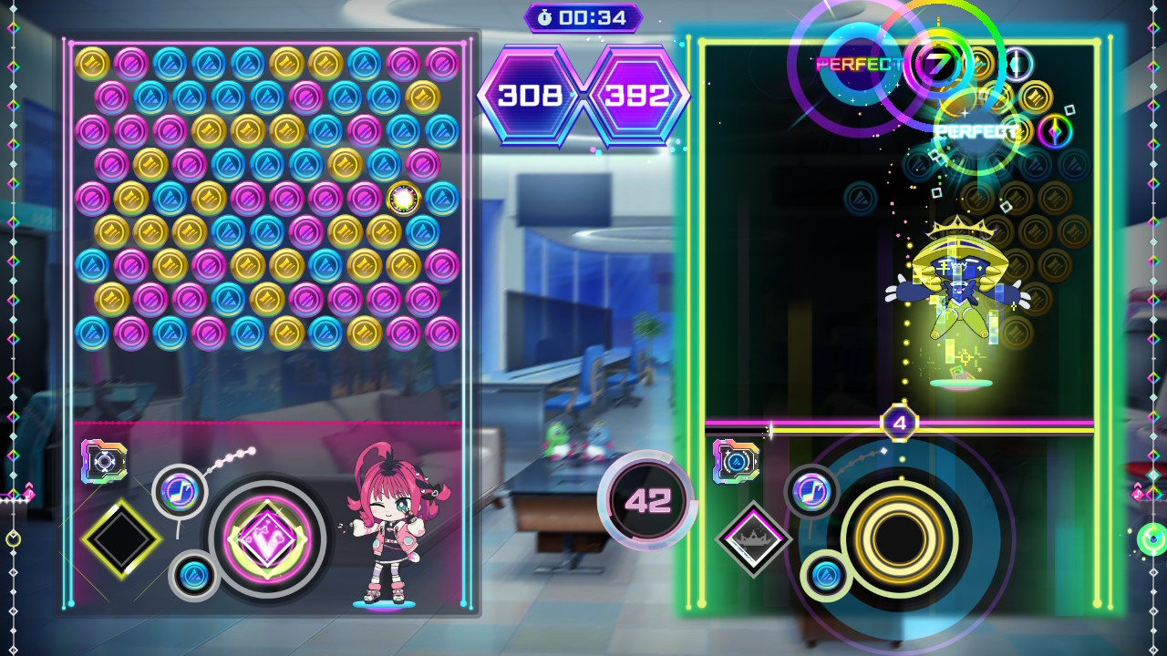 Outro aspecto a se ter em mente é que cada personagem possui uma habilidade própria, como a capacidade de mudar as cores de várias bolhas ou atrapalhar o adversário tampando a sua visão. Além disso, é possível equipar diferentes módulos para melhorar a performance, seja tornando a parte rítmica mais fácil, aumentando a pontuação obtida com cores específicas, etc.