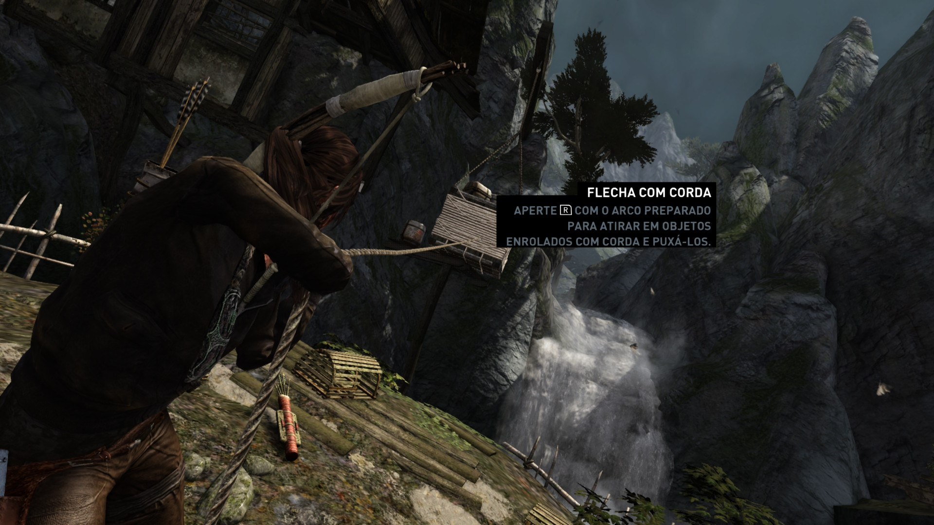 Continuando a conversa sobre o design de fases, gosto que, apesar do visual realista, Tomb Raider não se envergonha de ser um jogo. Todo local que eu preciso escalar ou que exige a minha atenção é bem demarcado na cor branca, disfarçado com tintas e cordas no cenário, mas o jogador sabe que ali é o ponto de interação; não vejo problema nenhum nesse tipo de situação e até acho que é um exemplo de bom design de jogo. Não é que o game me entregue todas as respostas, mas consegue me guiar num cenário que seria apenas ordinário no mundo real.