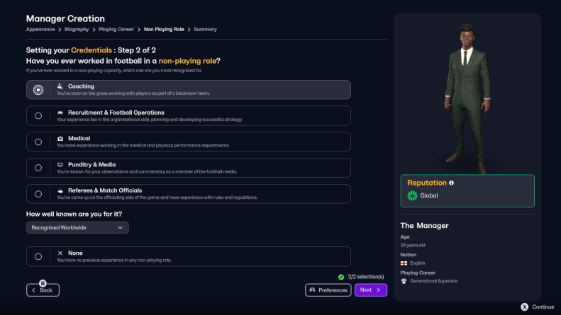 A principal novidade, contudo, é em relação ao histórico do treinador. Pela primeira vez, desde Football Manager 22 Touch, será possível definir um nível de reputação ao se criar um treinador novo. Aqui, isso será realizado através da criação de um background, sendo possível definir se seu treinador é um ex-jogador, seu nível de fama (desde ter sido um fenômeno até um pereba total) e então se ele possui alguma experiência extracampo antes de se tornar um manager. Essas decisões influenciam os empregos inicais (caso comece desempregado) e a pressão que será colocada sobre o treinador, além, é claro, de ajudar os jogadores a criarem suas próprias histórias dentro do jogo.