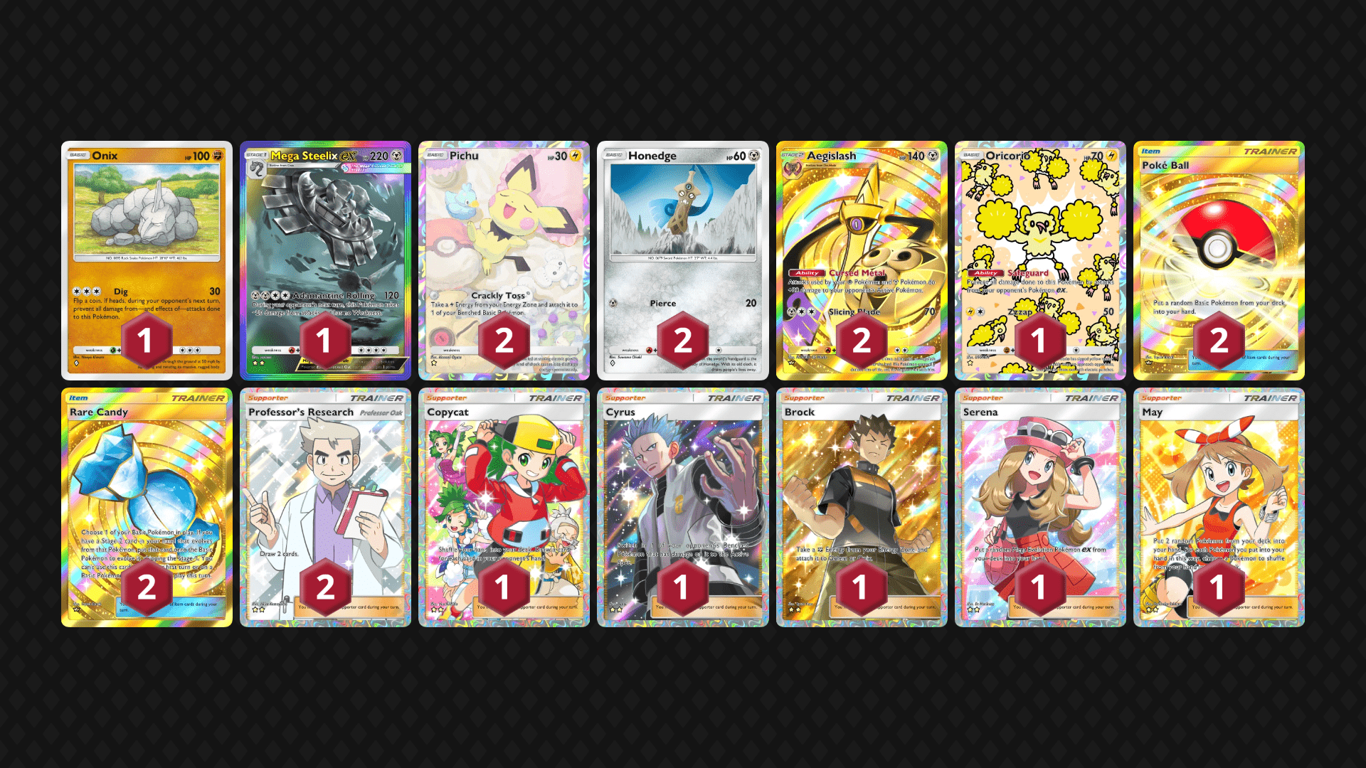 Para esta lista eu procurei encontrar um equilíbrio entre ofensividade e agilidade de montar uma boa board. Portanto, esta é uma lista baseada no que já estão testando atualmente para enegernizar Mega Steelix ex rapidamente, junto a uma outra que vi de um japonês aleatório que, embora consistente era lento demais.