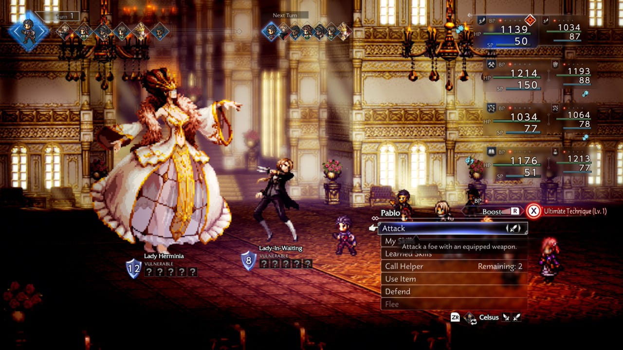 Temos a tradicional fórmula Break & Boost, onde a cada turno recebemos um BP para aumentar a quantidade de ataques ou de dano que realizamos no turno, e temos que explorar as fraquezas dos inimigos, usando-as repetidas vezes até que eles quebrem e fiquem vulneráveis por um turno a grandes quantidades de danos com defesa reduzida. Como sempre, essa fórmula é extremamente prazerosa, sendo sempre divertido descobrir as fraquezas dos oponentes e ver os grandes números de dano quando o inimigo finalmente fica vulnerável.