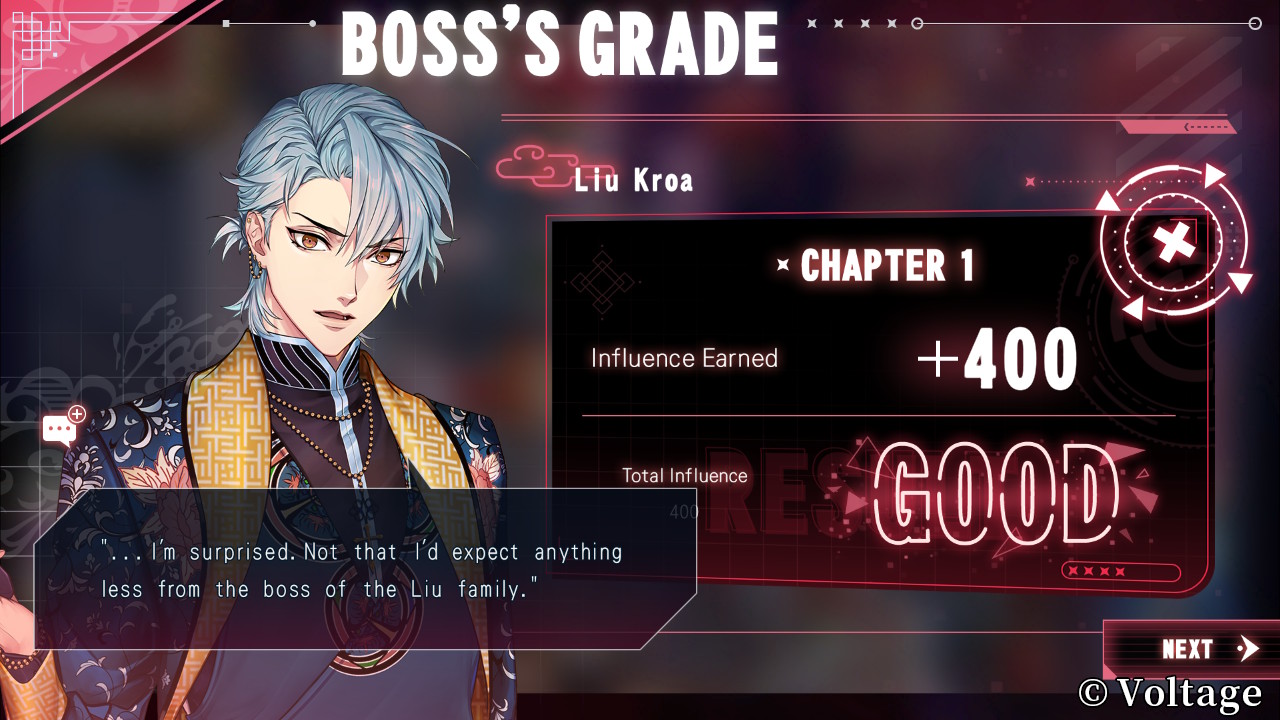 O jeito que Neon Clash -Echoes of the Lost- estrutura sua história me surpreendeu bastante na hora que pesquisei sobre um guia. Ao invés de rotas individuais para cada personagem, aqui só temos uma rota “comum” gigantesca de seis capítulos, que pode resultar em apenas dois finais: True Ending e Sad Ending. No final de cada capítulo, o jogo te dá uma nota com base nas escolhas que você fez, e te dá moedas com base nisso. Essas moedas podem ser utilizadas para liberar conteúdo extra, como pequenas cenas envolvendo personagens da trama, ou arquivos de profile.