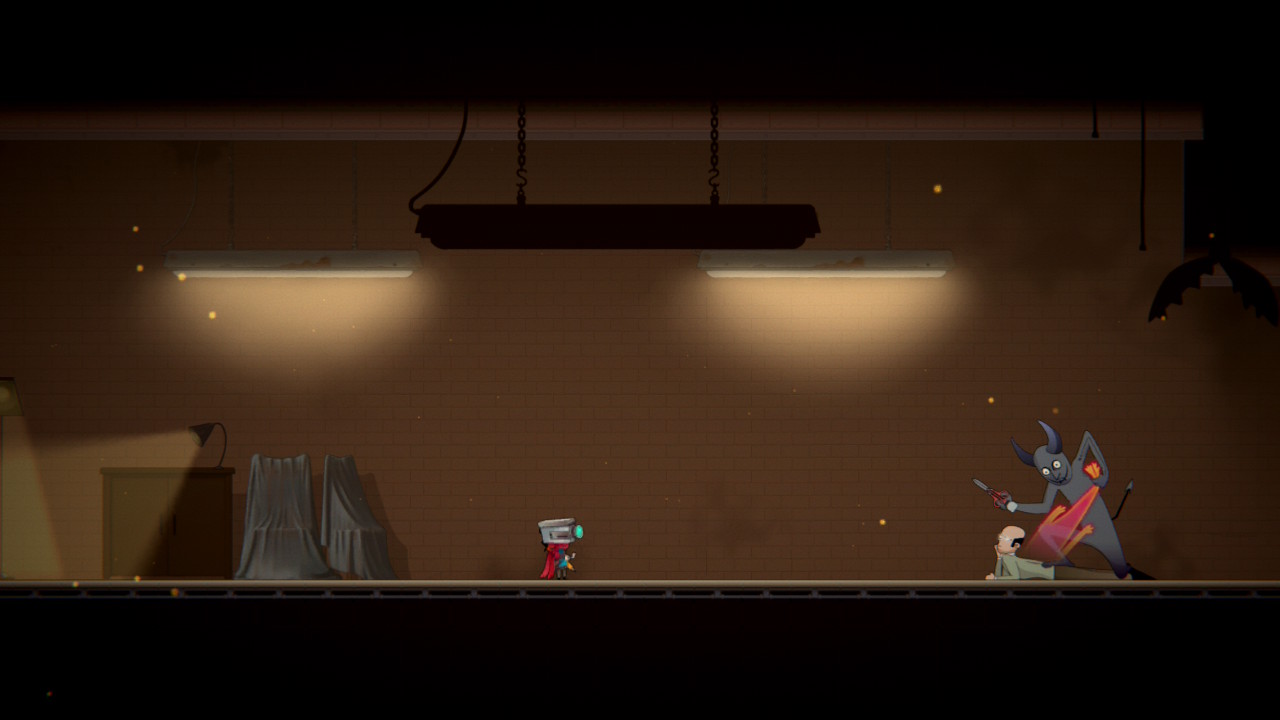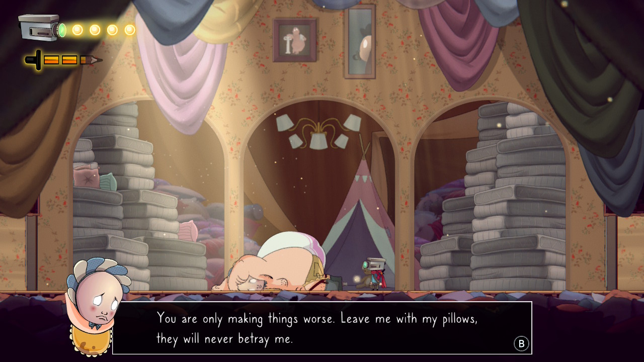 A partir de então, como todo metroidvania, podemos passar a explorar esse vasto mundo, recheado de inimigos, upgrades e bosses. Os cenários, contudos, são um pouco diferentes do usual: podemos encontrar uma floresta, mas feita dentro de um sofá, e lá podemos encontrar um hotel, mas que estará recheado de homens infantilizados, desesperados com a possibilidade de sair da zona de conforto.