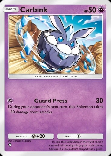 Para um estilo de jogo ofensivo, porém mais imediato, uma cópia do Carbink de Mega Ascenção pode ajudá-lo em um estilo de jogo aggro enquanto obriga o oponente a gastar recursos como o Picolé da Sorte, além de ser um bom nocauteador de Pokémon bebês devido o seu dano pontual.