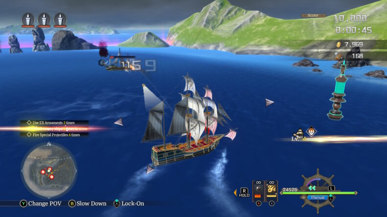 Além disso, existem certas ilhas que estão sob o controle dos Griegers, e através de um minigame de Recaptura, você consegue liberar essas ilhas e ganhar uns itens. A partir do Capítulo 4 inclusive, o jogo pipoca side quest para tudo que é lado, e por isso, consigo ver levando várias horas explorando cada cantinho desse mapa, ainda mais com os aprimoramentos que você pode colocar no navio.