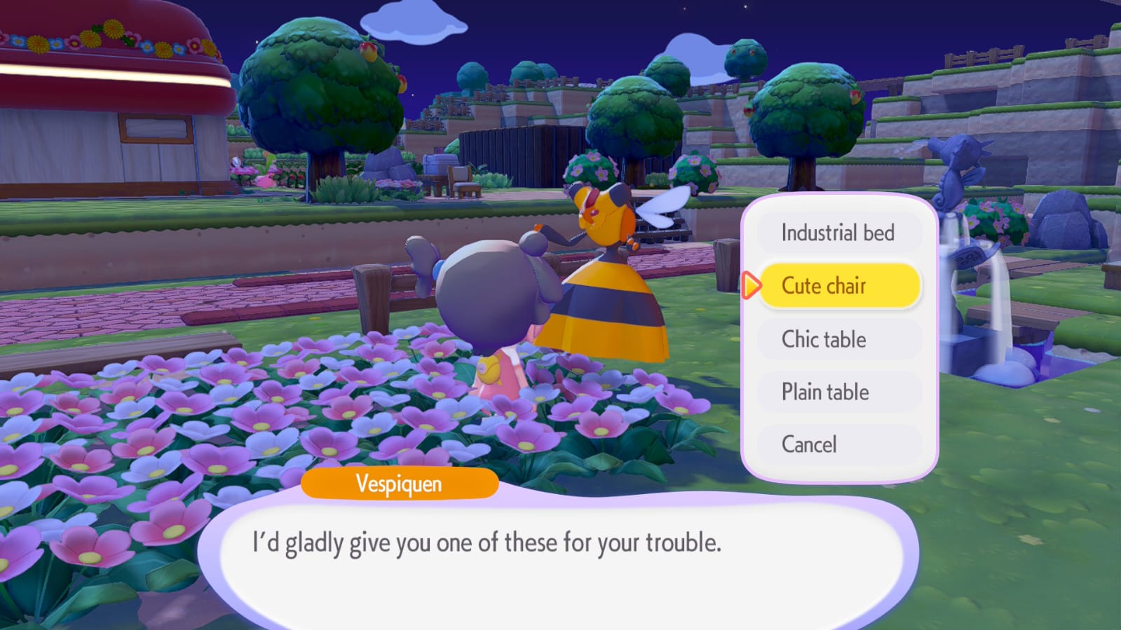 No começo do jogo, recomendo fortemente conseguir a Vespiqueen o mais rápido o possível, pois a cada dia ela libera uma gama diferente de itens que podem ser trocados por mel, recurso que pode ser conseguido facilmente em campos de flores em várias áreas do jogo.
