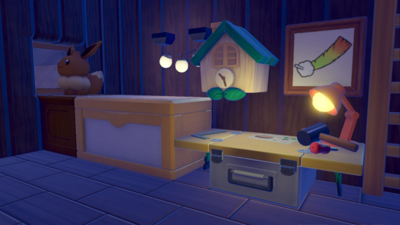 Outra herança de Dragon Quest Builders presente em Pokopia é que o jogador não precisa fazer todo esse movimento de ir até um baú, coletar os itens e para aí sim ir até a mesa de construção para fazer algum item. O jogo dá essa colher de chá e considera os itens alocados dentro dos baús ao lado da mesa como parte dos itens disponíveis para criar algo.