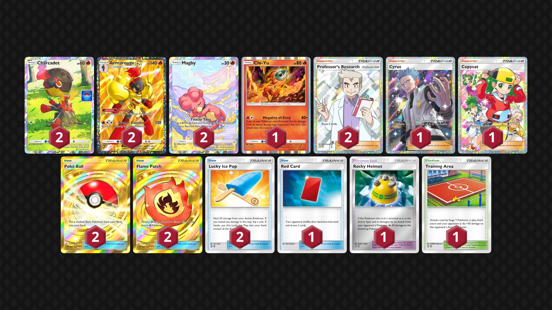Não só é ótimo como atacante alternativo, como também uma arma necessária contra possíveis Oricorio que possamos encontrar ao longo da estrada. Junto a tudo isto, Picolé da Sorte contribui muito para a alta durabilidade natural de Armarouge ex, além de uma cópia de Capacete de Pedra para ajudar a alcançar maiores danos e preparar o terreno para Cyrus no late-game. Caso prefira maior durabilidade, uma Capa Gigante é uma ótima opção também.