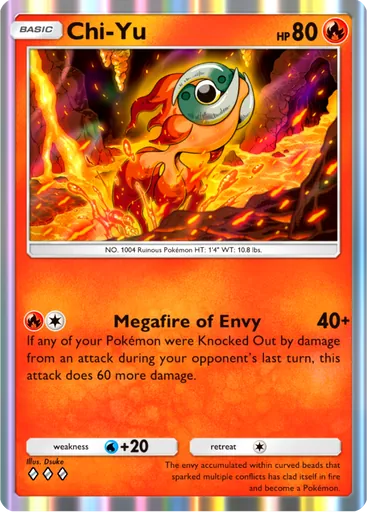 Embora Armarouge ex seja ótimo por si só, Chi-yu também é um parceiro natural e perfeito para o Pokémon de fogo de Paldea. Em questão de mecânica, Chi-yu é um “Marshadow de fogo” (40 de dano + 60 caso um Pokémon nosso tenha sido nocauteado no último turno), inclusive no custo de energia.
