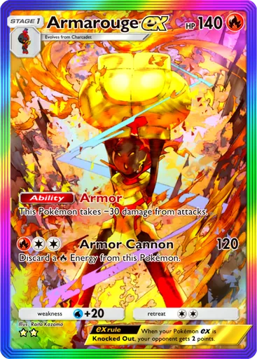 Tudo isso fica ainda melhor com sua habilidade que reduz 30 de dano de ataques naturalmente, o que faz com que, na prática, Armarouge ex seja um estágio 1 ex com 170 de PS. Interessante notar que, mesmo na rara ocasião de encontrarmos um Alolan Muk oponente na ranqueada, ele não afeta Armarouge ex de maneira alguma por anular apenas habilidades de Pokémon básicos — o que faz um bom cenário para utilizá-lo.