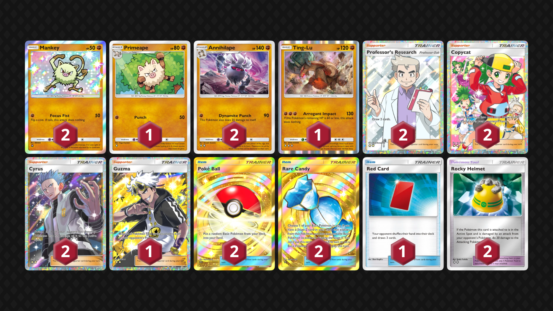 O mais recente Primeape chegou na coleção da 9ª geração, no entanto, o Primeape de Ilha Mítica, que causa 50 de dano por uma energia ou o de Dominação Genética que causa 40 e mais 60 caso tenha sido danificado também são ótimas alternativas. Porém, no decorrer de diversas tentativas, erros e experimentos, optei por esta versão que utiliza Capacete de Pedra, uma cópia de transição do Primeape de Ilha Mítica e um Ting-Lu como reforço por encaixar muito bem com seu ótimo dano.