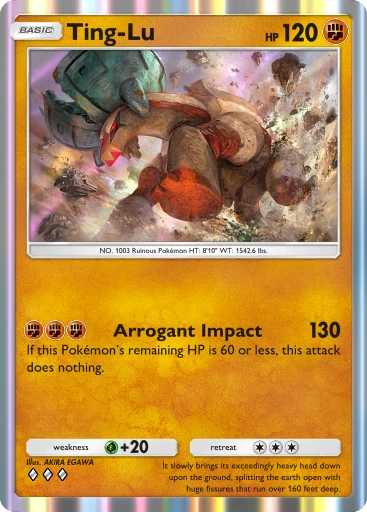 Ting-Lu executa um papel de finalizador com seus excelentes 130 de dano — algo muito raro em Pokémon básicos de um ponto. Não só isso, como também ser obrigado a ter ele como seu inicial no campo ativo é um dos únicos fatores de má sorte que pode te fazer perder o jogo, tanto por seu alto custo de recuo, como por seu efeito colateral de seu ataque: O ataque não faz absolutamente nada caso ele esteja por 60 de PS ou menos (o que não é muito difícil em seus 120 de pontos de vida).