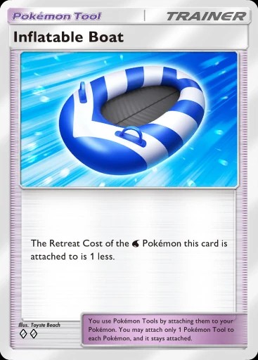 Para melhorar a economia de energias, o Bote Inflável ajuda na hora de pivotear seus Pokémon sem grande custo. Chien-Pao ex pode descer tranquilamente com custo zero enquanto Suicune ex ainda manterá uma energia anexada para poder atacar quando subir novamente. Baxcalibur no entanto, pelo menos manterá uma energia anexada ao descer pro banco.