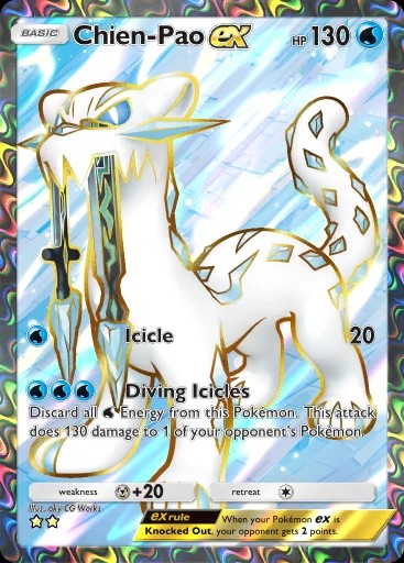 No entanto, olhando para Chien-Pao ex, é evidente que sua proposta é bem mais diferenciada de Greninja, focando-se em um tiro letal que pode nocautear o Pokémon de onde estiver, ou, deixá-lo tão fragilizado que é difícil en enxergar a possibilidade de vitória. Contudo, Chien-Pao ex funciona como uma carta de risco e recompensa: por ele descartar todas as suas energias após atacar, o tiro precisa compensar p fato de que, no turno seguinte, você estará tão vulnerável quanto o oponente.