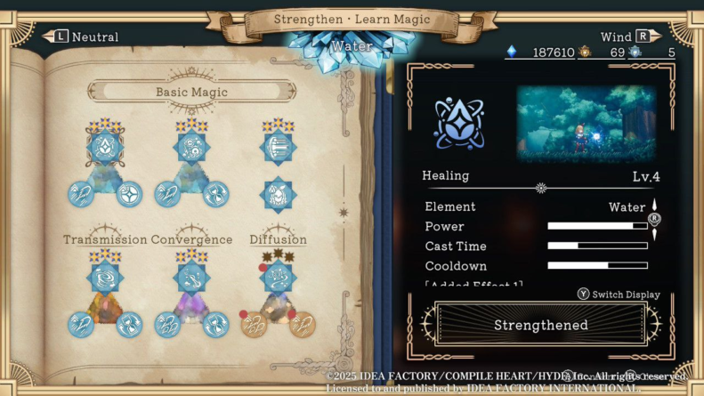 Além desses temas que envolvem mais a progressão do mapa e a jogabilidade 2D, o game pega emprestado mecânicas como equipamentos personalizáveis e uma árvore de habilidades para cada um dos quatro grande códices base (foto, terra, água e vento). Algumas magias são bem similares independente do elemento usado, mas outras são bem particulares, fazendo com que seja possível montar uma build bem personalizada com as 6 magias que podem ser equipadas.