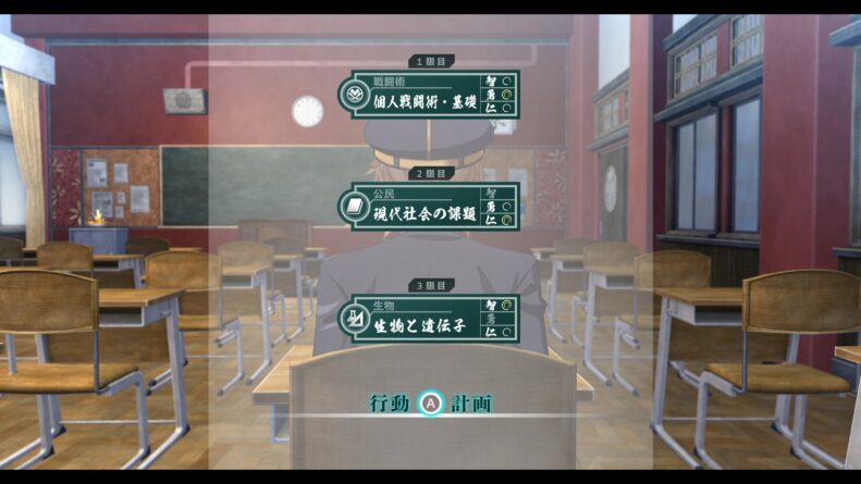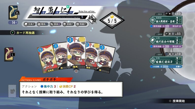 Para ir à aula, na tela de preparação, você escolherá quais Action Cards e Support Cards você deseja usar. Seus pontos de Sabedoria, Virtude e Valor aumentam com base nos resultados da aula.