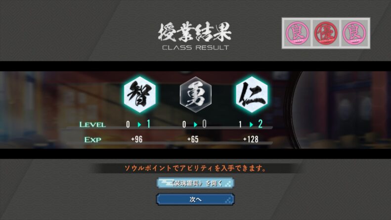 Ao frequentar aulas na Academia Hirasaka, você pode aprimorar seus poderes espirituais de Sabedoria, Virtude e Valor, usados para fortalecer seus Soul Armaments.