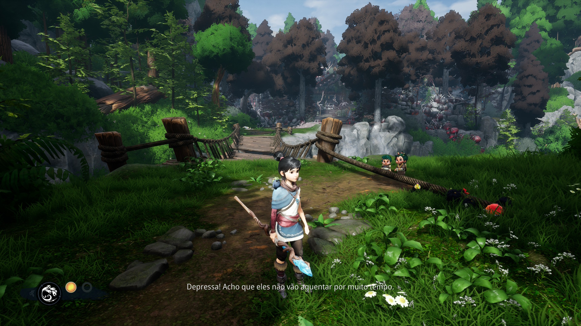 Apesar da proposta cinematográfica, não há muito para se destacar na narrativa de Kena: Bridge of Spirits. Os personagens chamam atenção pelos visuais e há uma tentativa de criar momentos para emocionar e fazer o jogador se conectar com os personagens que Kena encontra, no entanto confesso que para mim a maioria dos momentos pareceram rasos, gerando pouca conexão emocional. Para exemplificar rapidamente, a história da primeira parte do jogo é focada em dois garotinhos em busca do seu irmão.