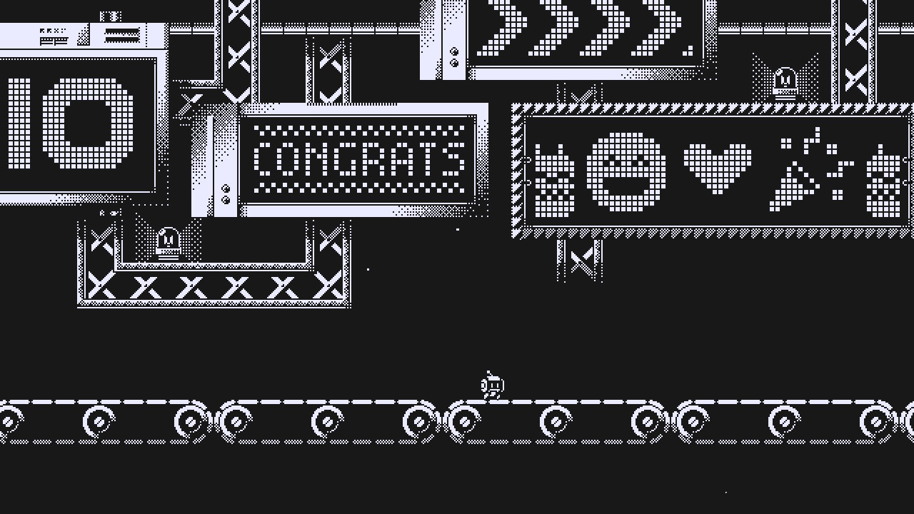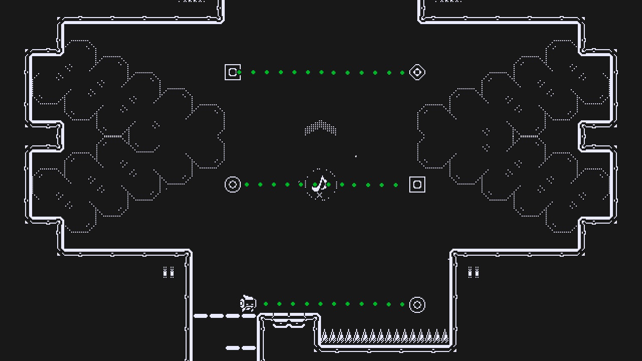 Não é uma arte rebuscada; na verdade, ela usa poucos bits por figura, então me lembra muito mais um jogo de Game Boy Color, ou mesmo de arcade antigo, do que um jogo moderno de pixel art. Temos apenaspreto e branco no cenário todo, e as cores (verde e vermelho) só são usadas para duas coisas indicativas.