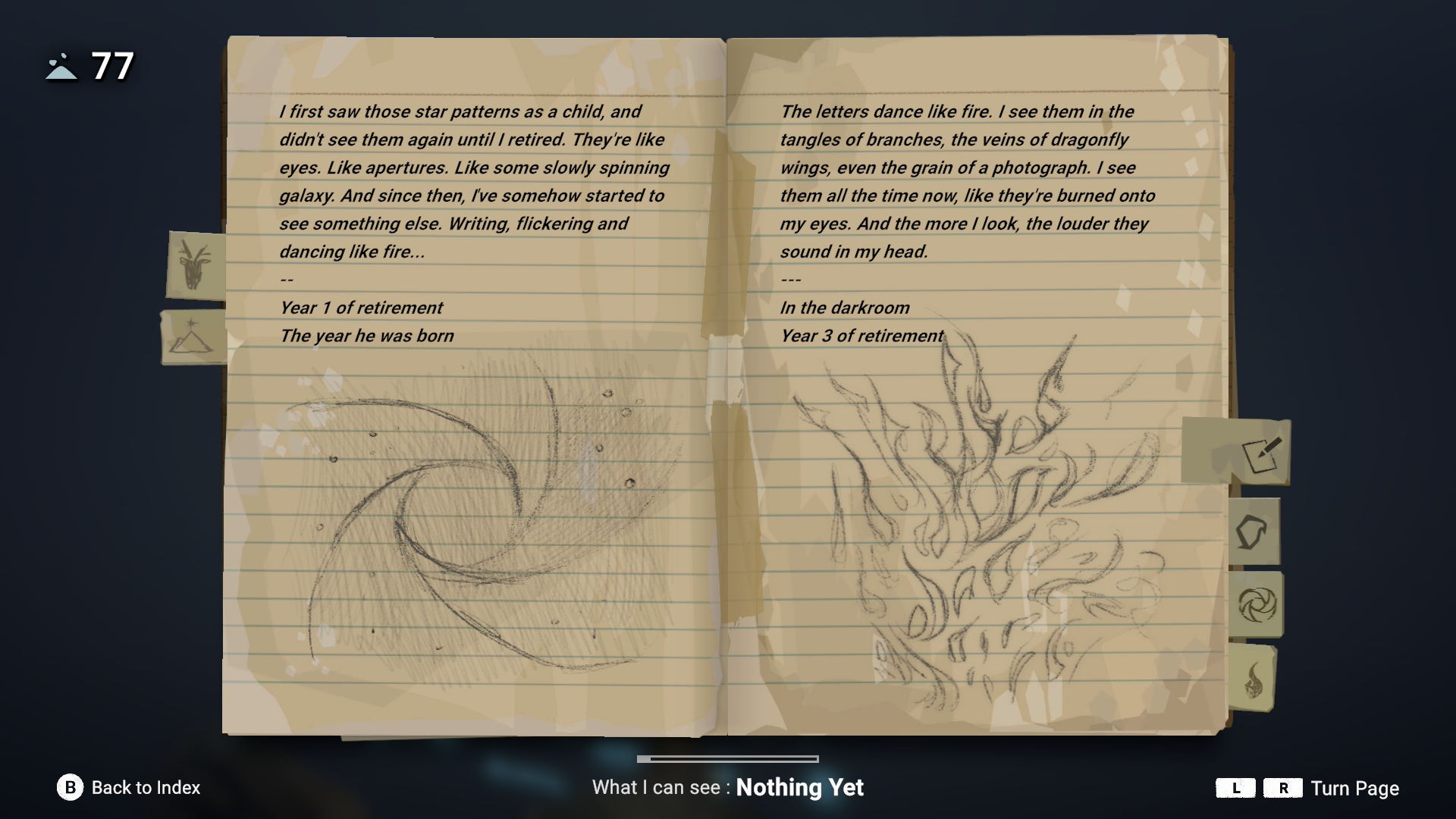 O problema, contudo, é que muitas seções são scriptadas, limitando as formas como podemos interagir com o mundo. Na maior parte, andamos em uma área limitada, com muitos prompts de interação para lermos textos enigmáticos, e depois Eugene sugere tirarmos fotos. Existem objetivos secundários, em fogueiras, onde devemos entregar fotos de elementos escondidos no mapa, mas esses momentos de interação na verdade são escassos quando comparados às cutscenes.