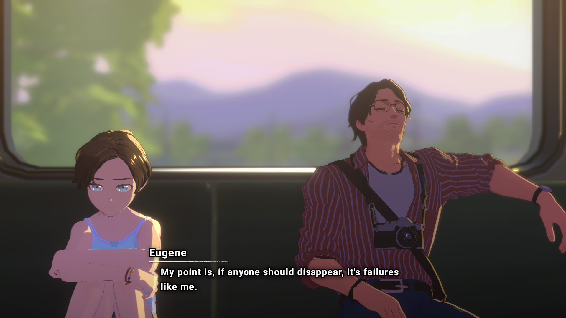 Se o mundo, o estilo e os personagens remeter a películas do studio ghibli, é porque essa é a essência do visual do título. Ser transportado a um local com ampla vegetação resgata um sentimento nostálgico em Eugene, que costumava andar por regiões parecidas com seu avô. Pouco a pouco vamos conhecendo esse personagem tão interessante a partir de memórias que ele busca suprimir, mas que no fim sempre estavam lá, guiando-o e forjando-o.