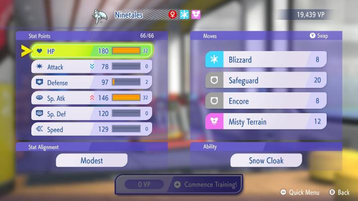 Aqui, no entanto, podemos resolver tudo com o clique de um botão. O processo custa uma moeda padrão do Champions, que pode ser obtida em abundância num ritmo razoável, deixando o jogador livre para experimentar com rapidez e dinamismo diferentes configurações da distribuição desses status. Naturezas, habilidades e golpes, tudo é pauta superada com a exploração desse mesmo menu e com essa mesma facilidade e custo simbólico na moeda padrão do jogo.
