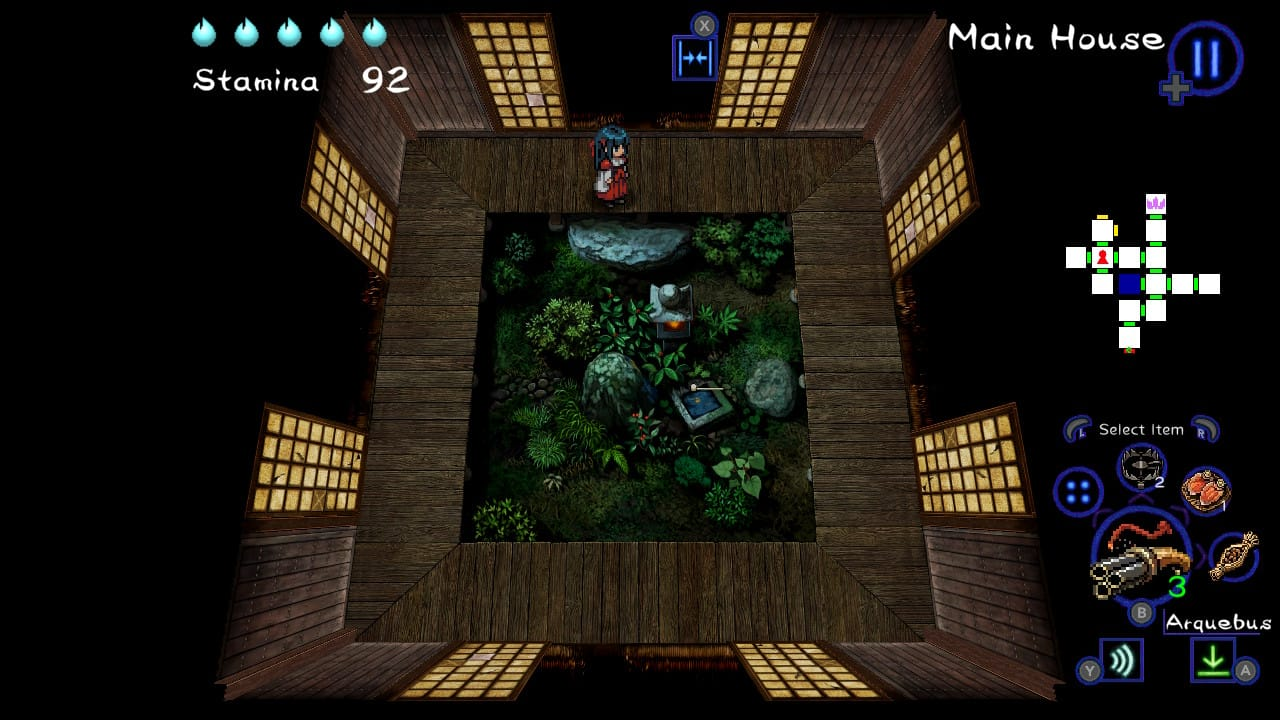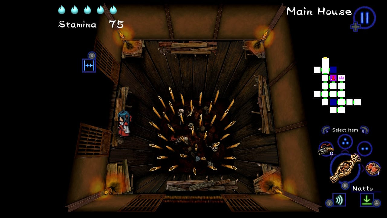 Todos esses são elementos importantes ao lidar com o jogo em geral. A gameplay é isolada em masmorras separadas, e ao começar cada uma, o inventário retorna ao tamanho padrão — apenas 3 espaços —, geralmente com uma arma para defesa pessoal e munição, a qual é consideravelmente limitada, tornando a escolha de ensinar ao jogador como lidar com essas criaturas de forma além do confronto direto uma excelente escolha. Às vezes, temos também alguns itens para cura.