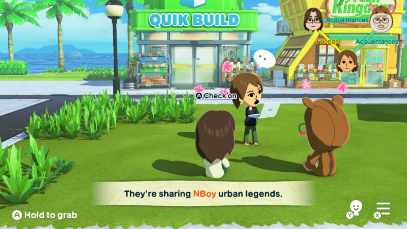 O relógio do jogo acompanha o da vida real, o que significa que todo dia as ofertas de algumas lojas mudam e os itens são alterados. Na Fresh Kingdom, podemos comprar comidas pra alimentar os Mii, que possuem preferências de comida completamente distintas; na Where & Wear, é onde podemos comprar roupas; e na Quik Build, temos objetos que servem pra decorar a ilha. Além disso, temos a MNN, torre de notícias que diariamente transmitirá algum absurdo sem sentido e engraçado sobre os moradores da ilha.