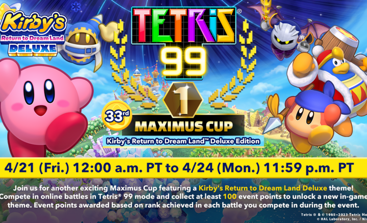 Tetris 99 | 33rd MAXIMUS CUP, com o tema Kirby’s Return to Dream Land Deluxe, ocorrerá no dia 21 de abril Nintendo Switch Online Tetris 99 | 33rd MAXIMUS CUP, com o tema Kirby’s Return to Dream Land Deluxe, ocorrerá no dia 21 de abril Marcos Vinícius 17/04/2023